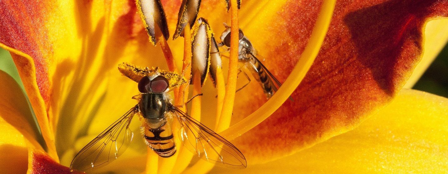 Les syrphes sont souvent confondus avec les abeilles ou les guêpes, mais ils sont inoffensifs. Ils n’ont pas de dard et ne peuvent donc pas piquer. Leur ressemblance n’est pas un hasard, mais relève du phénomène de mimétisme. Autrement dit, le syrphe imite la guêpe pour paraître plus dangereux auprès de ses ennemis naturels.